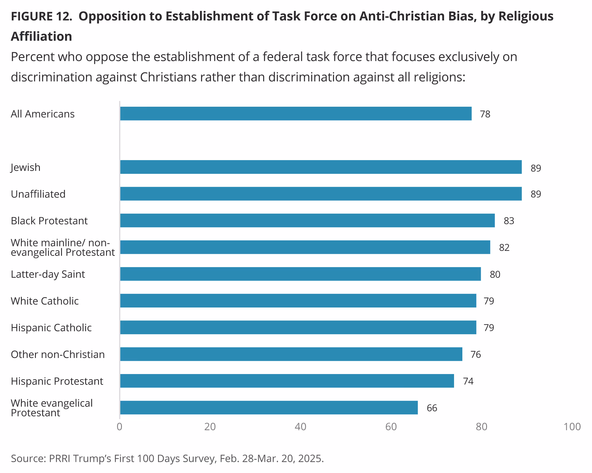 Jewish Americans (89%) and the religiously unaffiliated (89%) express the highest opposition to the establishment of a task force on anti-Christian bias, followed closely by Black Protestants (83%), white mainline/non-evangelical Protestants (82%), Latter-day Saints (80%), white Catholics (79%), Hispanic Catholics (79%), other non-Christians (76%), and Hispanic Protestants (74%). Although still a majority, white evangelical Protestants (66%) report the lowest opposition.